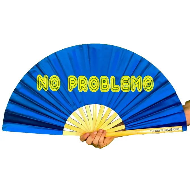 The Gay Fan Club No Problemo Fan is a high-quality funny hand fan featuring a blue background with the text, no problemo.