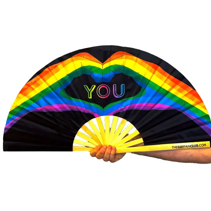 The Love You Fan features a black background and two rainbow arms forming a heart in the center with the word You centered inside the heart.