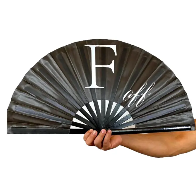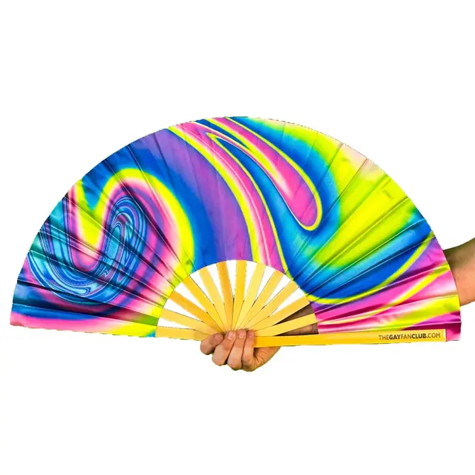 UV-reactive bamboo hand fan design that changes color under black light. TheFluid Fan (UV) is a top-selling circuit party fan and is a popular choice in the Trans community.