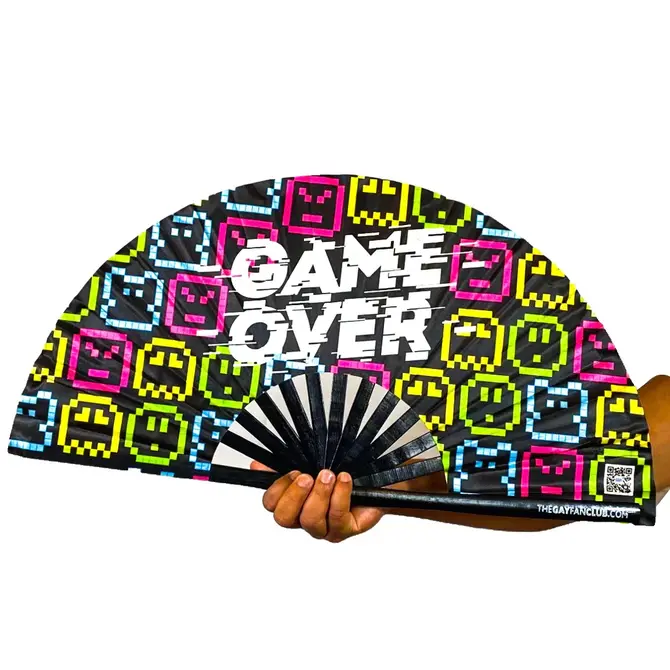 Great for Gaymers, Gays, or Girls, this best circuit party fan features Pac-Man characters with the text "Game Over" on a high-quality silk screen.
