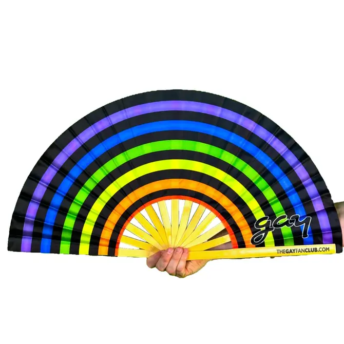 This rainbow hand fan features a black and rainbow patterned design that looks electrified under black light. The Electric Rainbow Fan is a popular hand fan choice for use at Pride festivals, circuit parties, music festivals, and raves.