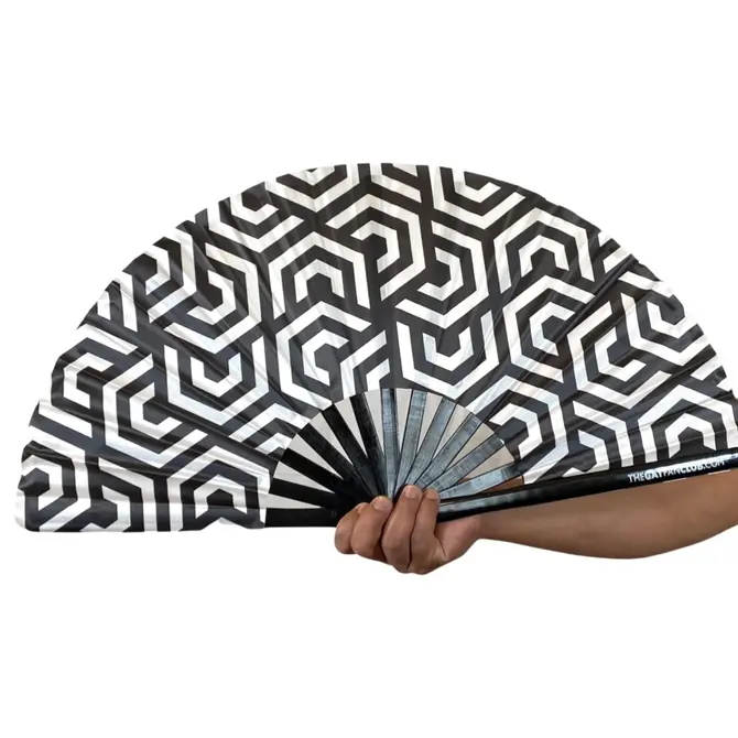 This high-quality bamboo clack fan features a mesmerizing black-and-white repeating pattern.