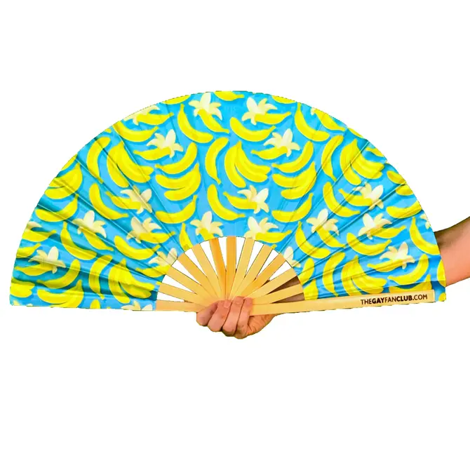This fan features a cute blue and yellow banana design with a natural bamboo handle.